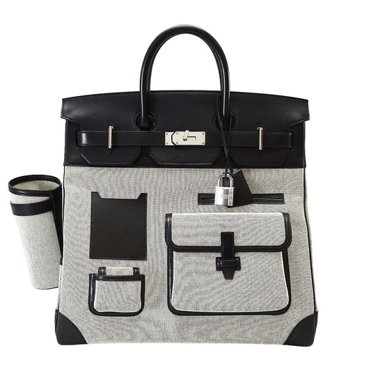 [Pre-loved] HERMES Handbag Haut a Courroies 40 Cargo Pocket Noir (Black)/Ecru Toile H/Evercalf Silver HW Stamp W[USED SA][Authentic]