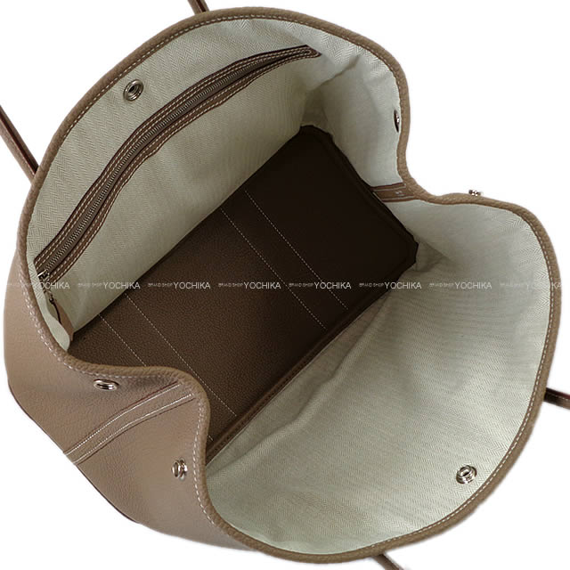 As it is said that the beginning was made as a gardening tool case, the leather which did it well is used for the bottom, and, according to the name, is strong at all; Hermes garden party boasting the lightness! A4 size is included easily, and the lining gains one place of fastener pocket with cloth. There is the convenience that I use even what kind of scene from a storing power and the business scene which I did well to casual clothes and am easy to do and is the bag which is convenient at all if I have one! Etoupe with a color now rare as for the color and equal popularity. The always available color is garden party and just affinity! Color:Etoupe(18) Material:Veau Negonda Buckle:Silver HW Accessories:box、storage bags Specification: [Inner pocket]