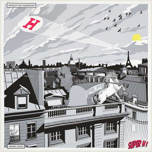 Carré 70's "Midnight Fauvre" is now in stock! A few seasons ago, "Quand soudain/Suddenly then! A dramatic scene depicted as a sequel to the "Quand soudain" pattern from a few seasons ago. The midnight bells ring in Paris, and the H signal is emitted from the Eiffel Tower! It is a sign calling for the hero "Super H"! The masked and cloaked superhero is about to take off! Just looking at it is exciting! The beautiful Kare, a modern sublimation of a playful story, will subtly add color to your life. How about it for a fashionable point of reference? Color:Blanc (White)(01)/Noir (Black)(89)/Gris Material:Silk100% Accessories:box Additional info: Product Condition: EXCELLENT SKU:25052808