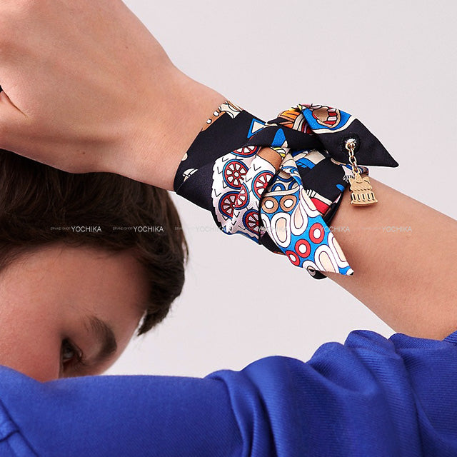 2023 AW HERMES scarf Twilly Charm Patisserie Francaise Noir (Black)/Blanc (White)/Blue Cotton100% Champagne Gold HW[EXCELLENT][Authentic]