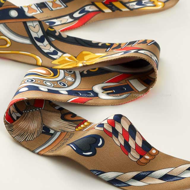 2024SS HERMES scarf Twilly HARNAIS DE COEUR Beige Fonce/Red/Anthracite Silk100%[EXCELLENT][Authentic]