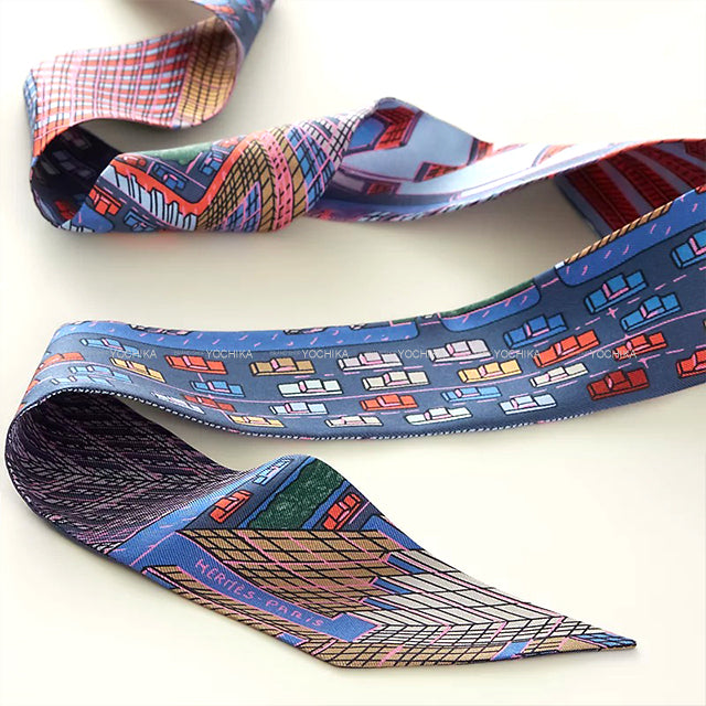 2023AW HERMES scarf Twilly Pantin City Blue /Rose/Vert Silk100%[EXCELLENT][Authentic]