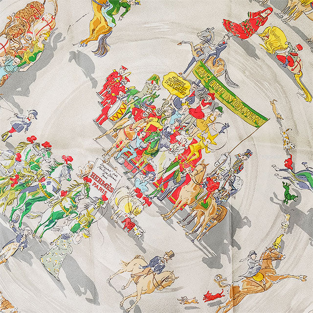 "Parade CIRQUN MOLER" which gives off original presence in an archive design of the Hermes. It is the rare vintage scarf that the fantastic view of the world of the circus was painted with a minute whole pattern in a motif. The coloring based on chic gray and black gives presence of mind and dignity in a bold design and is finished in the balance that it is easy to adopt for coordinates. I adopt 100% of highest grade silk which Hermes is proud of to material. How about by all means at this opportunity? Color:Grey/Noir (Black)(89) Material:Silk100% Size:#40 Accessories:No accessories Product Condition: LIKE NEW SKU:25091106