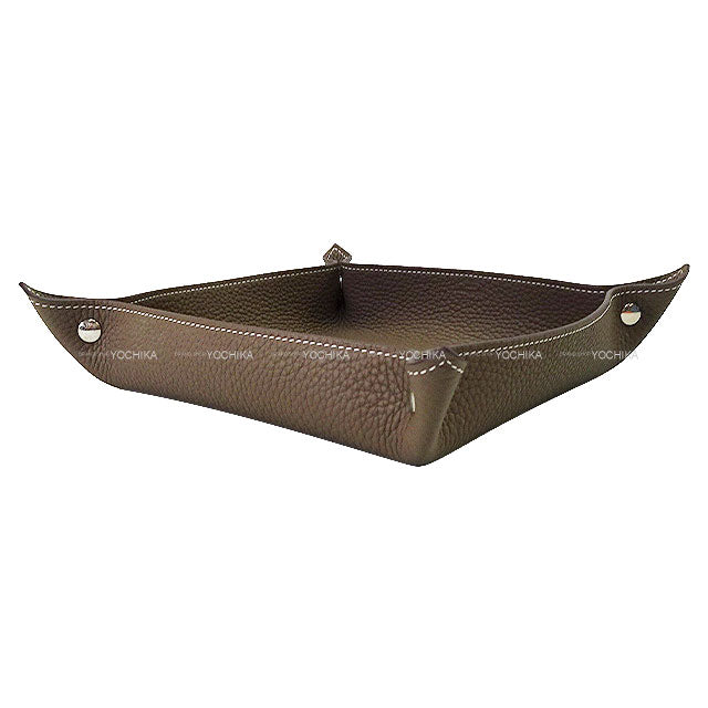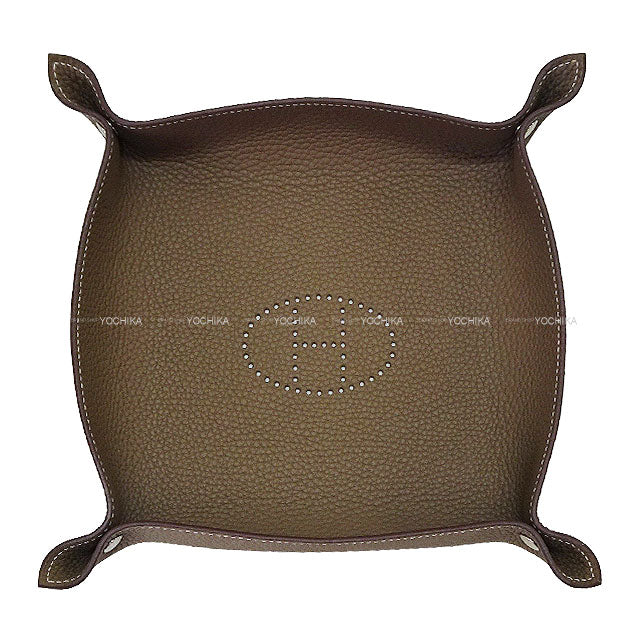 An elegant Vide-Poches featuring Hermes' iconic H Evelyne perforation at the center. Crafted from supple Taurillon Clemence leather in the timeless Etoupe color, it blends seamlessly into any interior setting. Perfect for holding keys, jewelry, or other small essentials, this refined tray brings a touch of Hermes sophistication to your everyday life. Ideal for the desk, entryway, or bedside. A thoughtful and luxurious gift—why not take this opportunity to experience its elegance yourself? Color:Etoupe(18) Material:Taurillon Clemence Accessories:No accessories Additional info: Product Condition: LIKE NEW SKU:25101404