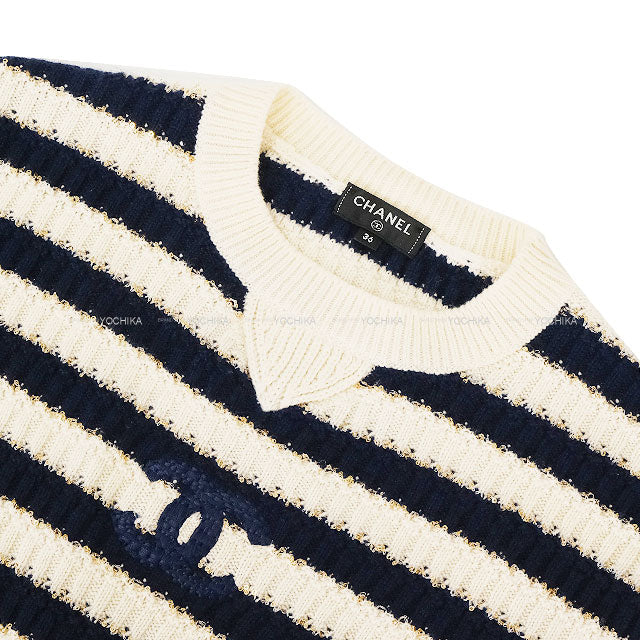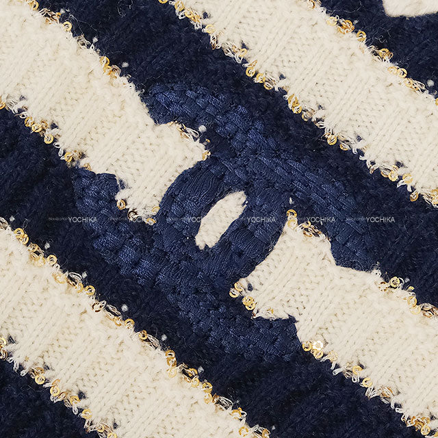 2021 Cruise Collection CHANEL Sweater Knit Border COCO Mark Sequin Ecru/Navy Cashmere/Polyester/Polyamide #36 P70336[EXCELLENT][Authentic]