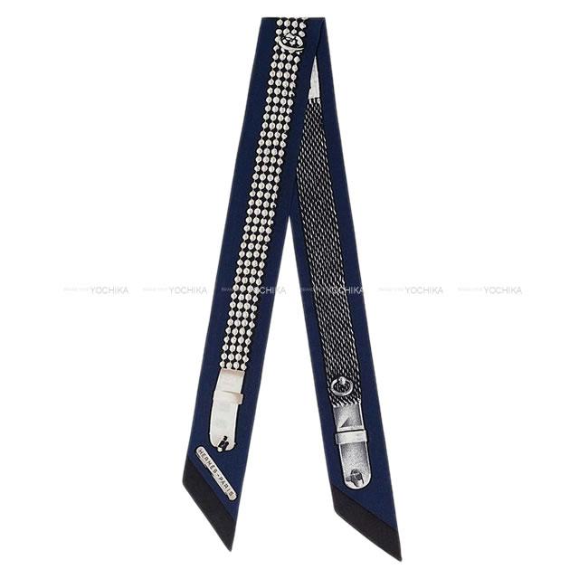 HERMES scarf Twilly Blue Marine/Gris/Noir(Black) Silk100%[EXCELLENT][Authentic]