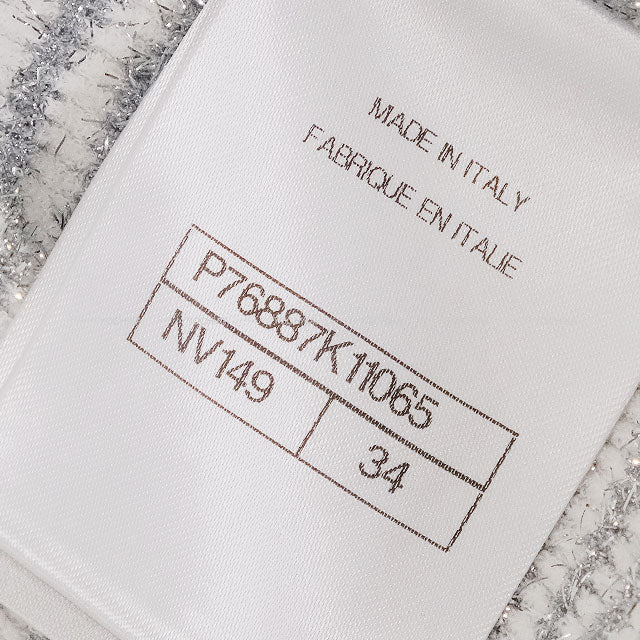 This shimmering knit pullover from CHANEL has arrived. Crafted in white with subtle silver threads, it adds a refined sparkle to any outfit, creating an effortlessly sophisticated look. The iconic Coco buttons at the front serve as a classic yet modern accent. Made from soft viscose and polyester, it offers comfort along with style. Perfect for everyday wear or special occasions, this piece embodies both elegance and luxurious quality. Color:Blanc (White)/Silver Material:Viscose/Polyester Size:#34 Total length:42.7cm Body width:36.5cm Sleeve Length:54cm Shoulder width:34.5cm Accessories:No accessories Additional info: Product Condition: EXCELLENT SKU:25111727