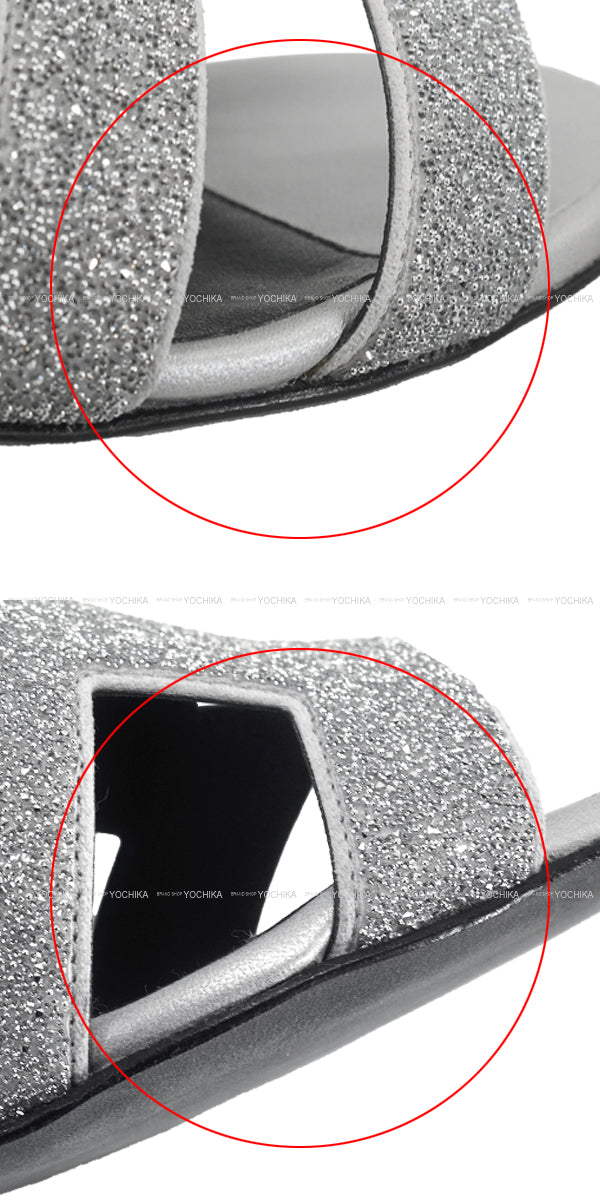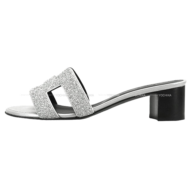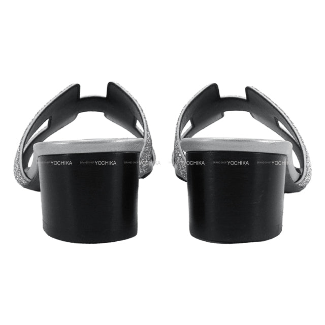 HERMES sandals H-motif Heel OASIS glitter Silver/Black Calfskin #35.5[ALMOST NEW][Authentic]