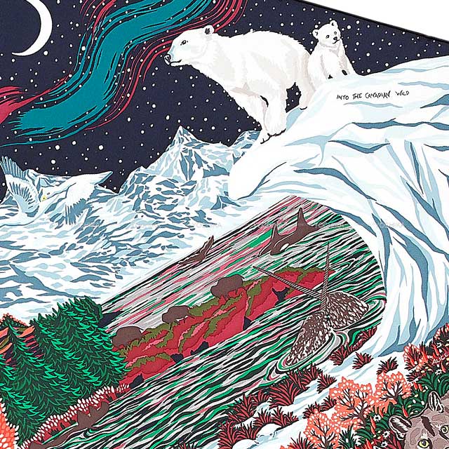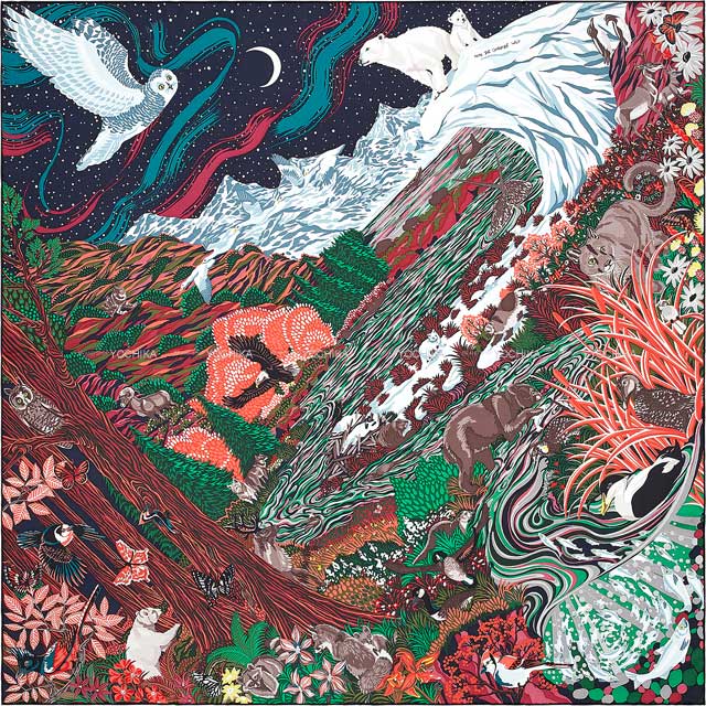 HERMES scarf Carre 90 Into the Canadian Wild Vert/Coral/Bordeaux Silk100%[EXCELLENT][Authentic]