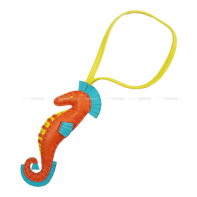 [Pre-loved] HERMES bag charm Hippo Seahorse Orange Poppy/Bleu Azteque/Lime Agneau Milo Stamp B[LIKE NEW][Authentic]
