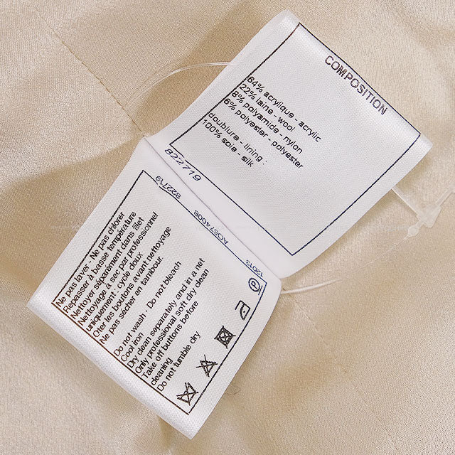 The long jacket with the here mark button which wore elegance only in CHANEL. I adopt the material which blended wool with acrylic to the tweed of the soft ivory color and have light comfort and moderate thickness. A three-quarter sleeve design gives a classical and light impression and directs refined wearing regardless of a season. The here mark button of gold metal fittings is gorgeous; accentuate, and is the first place that raises the clothing just to put. At this opportunity by all means. Color:Ivory Material:Acrylic/Wool Size:#44 Total length:95cm Mid Collar to Sleeve End:63.5cm Body width:54cm Buckle:Gold HW Accessories:No accessories Product Condition: BRAND NEW SKU:25090302