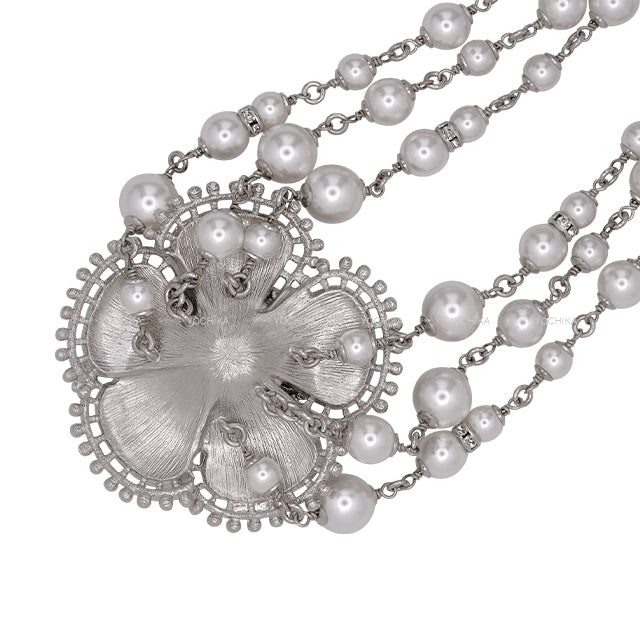 A striking choker has arrived from Chanel. It features a bold camellia reminiscent of a brooch.A triple pearl chain on the side adds an extra touch of glamour.It's perfect not only as a stylish accent, but also for special occasions. It's a timeless piece that exudes the elegance of Chanel. Why not take this opportunity to get your hands on one? Color:Noir (Black) Material:Pearl/Strass Buckle:Silver HW Accessories:box、storage bags Additional info: Product Condition: BRAND NEW SKU:25111117