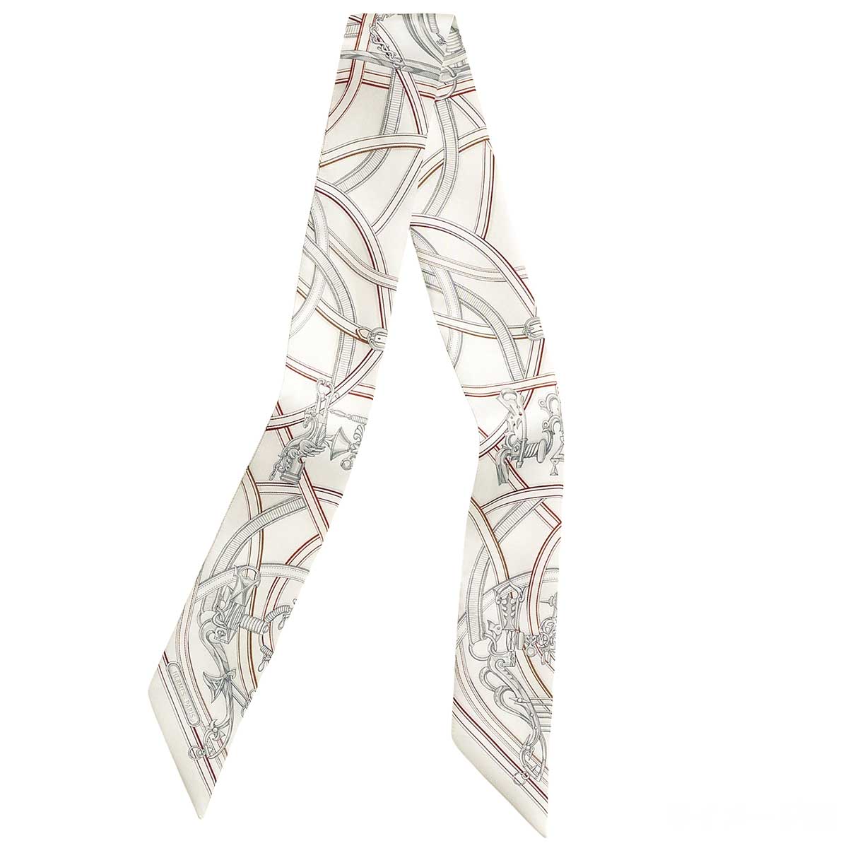 HERMES scarf Twilly Harnais Legendaire Blanc (White)/Gris Perle/Rouge H Silk100%[BRAND NEW][Authentic]